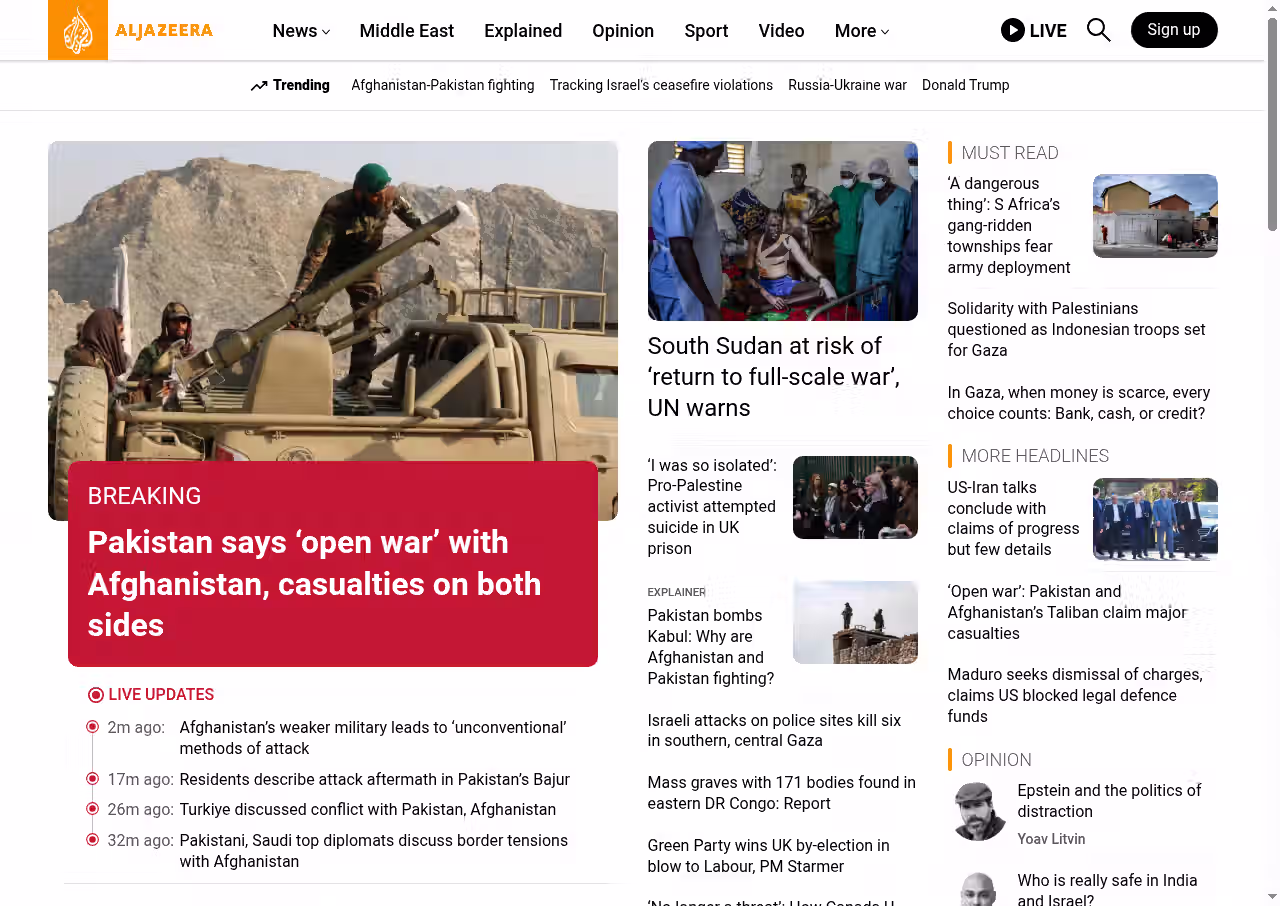 Multiple active warfare zones are escalating simultaneously, with Pakistan declaring open war on Afghanistan, Middle East tensions rising, and great power strategic competition intensifying through economic and military means.