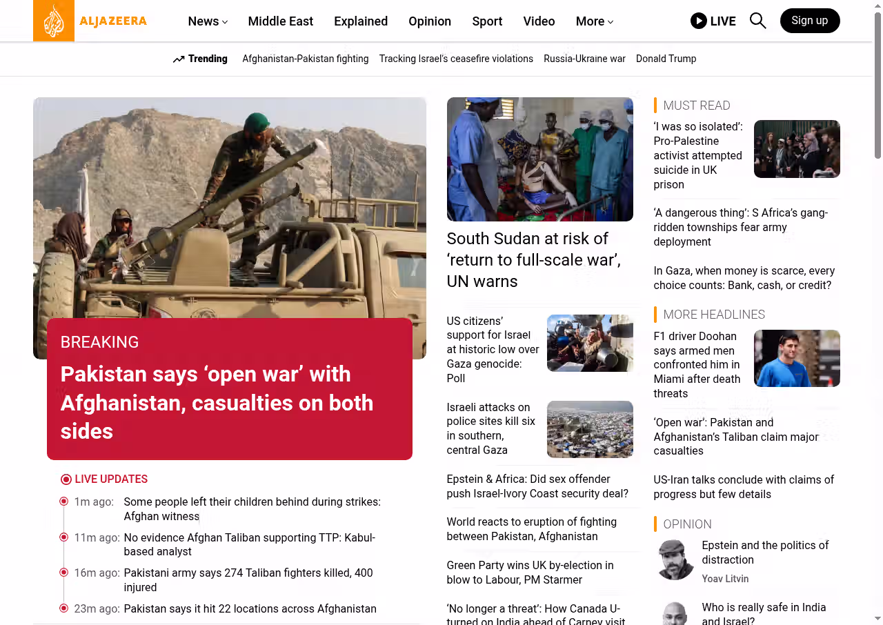 Multiple active warfare zones are escalating simultaneously, with Pakistan declaring open war on Afghanistan, Middle East tensions rising, and great power strategic competition intensifying through economic and military means.